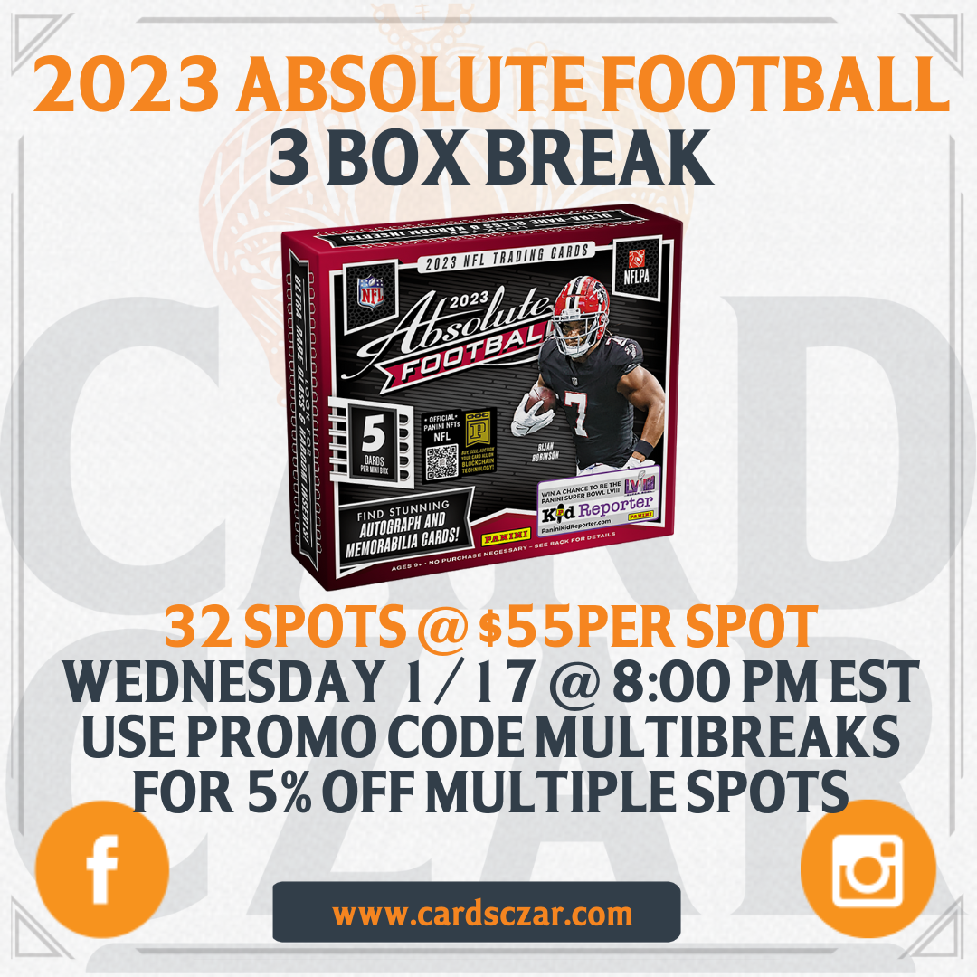 2023 Absolute Football 3 Hobby Box Break The KABOOM chase is here and Card Czar will be bringing the breaks LIVE to you on Wednesday night, because of course we are! This break will be: 2023 Absolute Football Hobby x 3 What's in the break? (On Average): 3 Rookie Patch Autos (RPM) 6 Additional Autographs... View Article