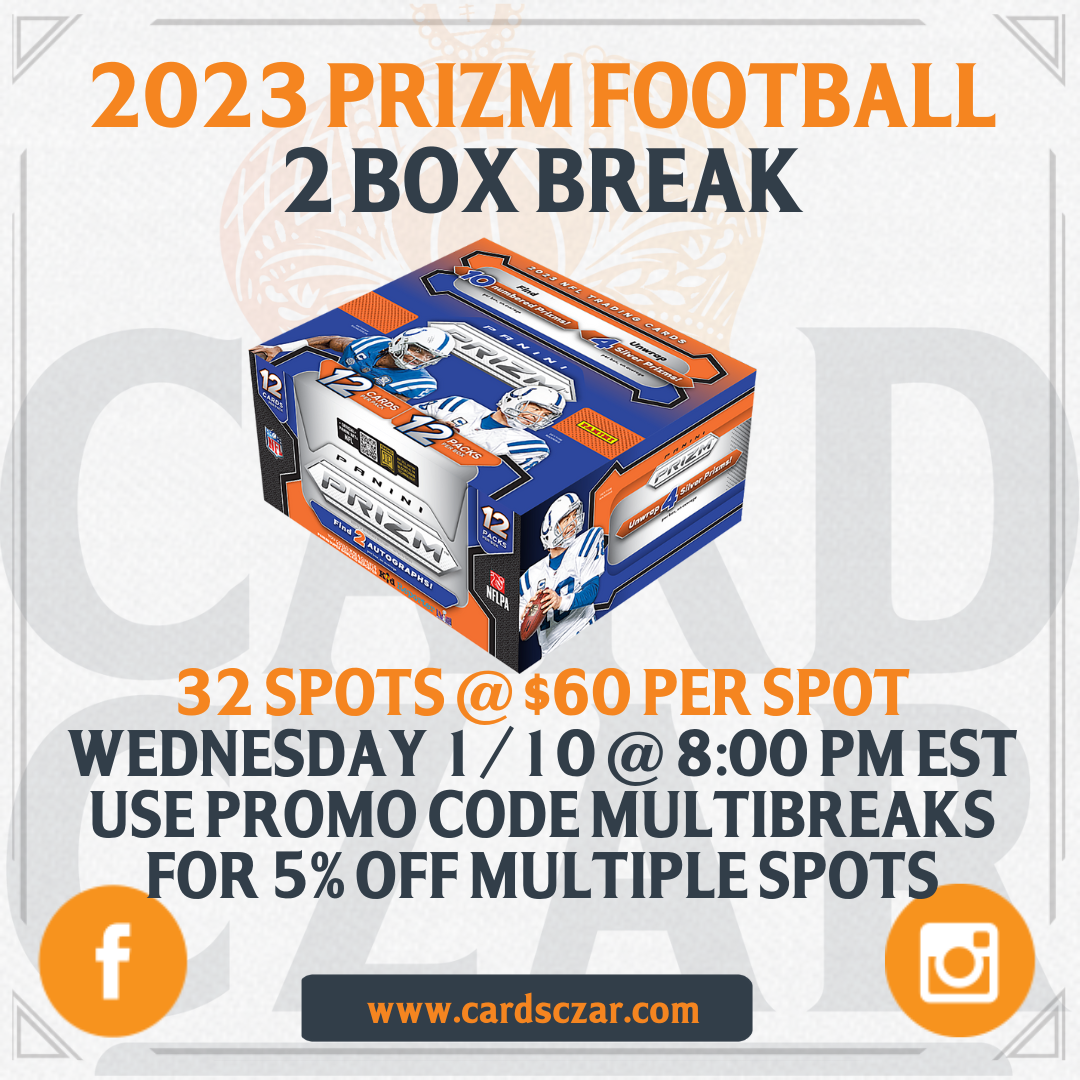 2023 Prizm Football Hobby Box Divisional Break We all know what time it is. PRIZMMMM is here and Card Czar has plenty of boxes for your ripping and breaking pleasure. Wednesday night will surely be one to remember, as we plan on opening up MULTIPLE breaks! This break will be: 2023 Prizm Football Hobby Divisional... View Article