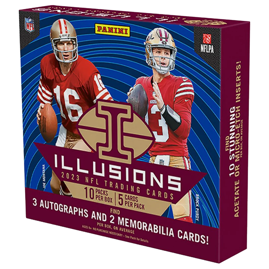 BASE TROPHY: 2023 Illusions Football captures the unbridled excitement of the NFL with a 100-card base set, featuring the game's top stars and rookies as well as a stunning assortment of Trophy Collection parallels.