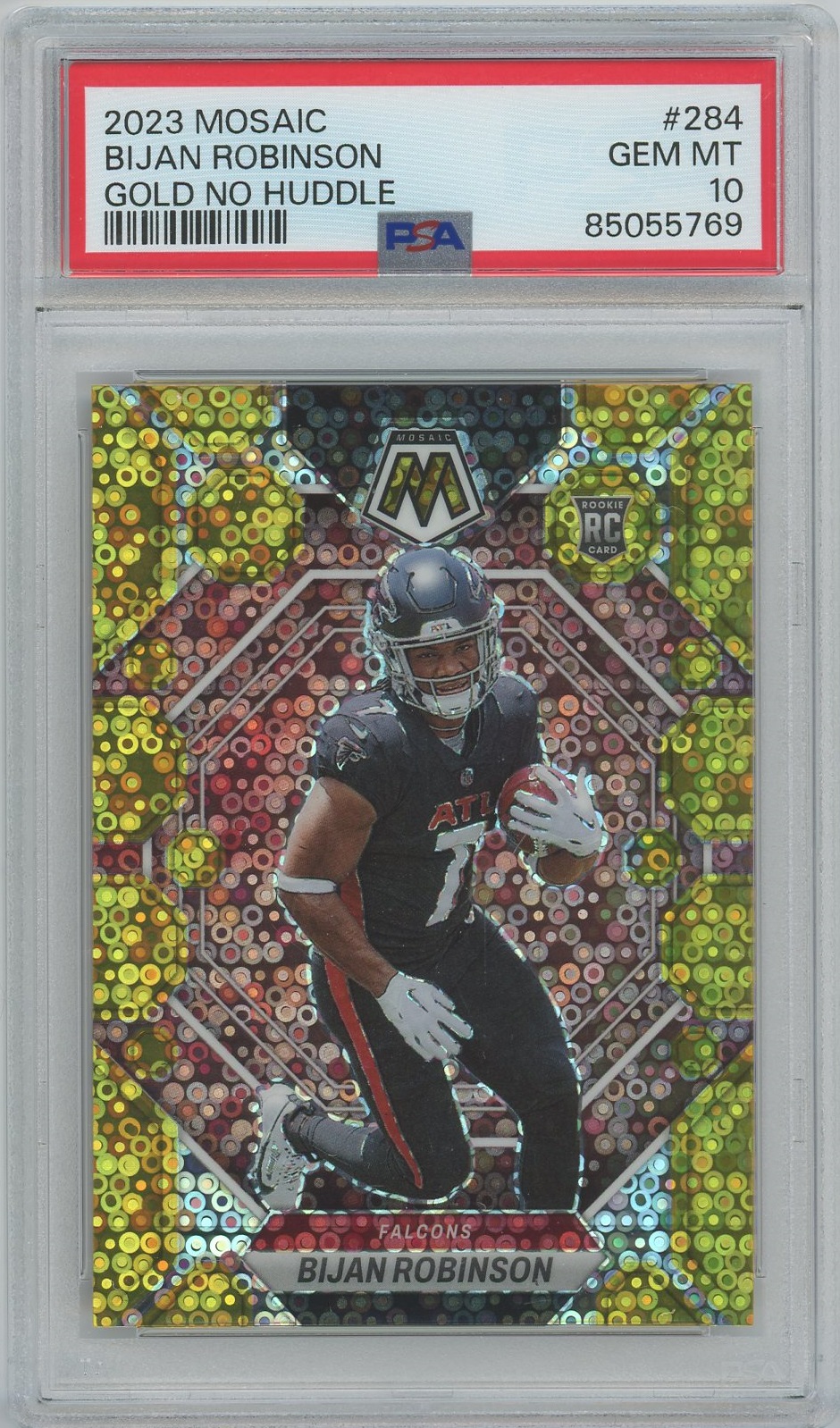 Bijan Robinson 2023 Mosaic No Huddle Gold Disco- #’d 10- PSA 10