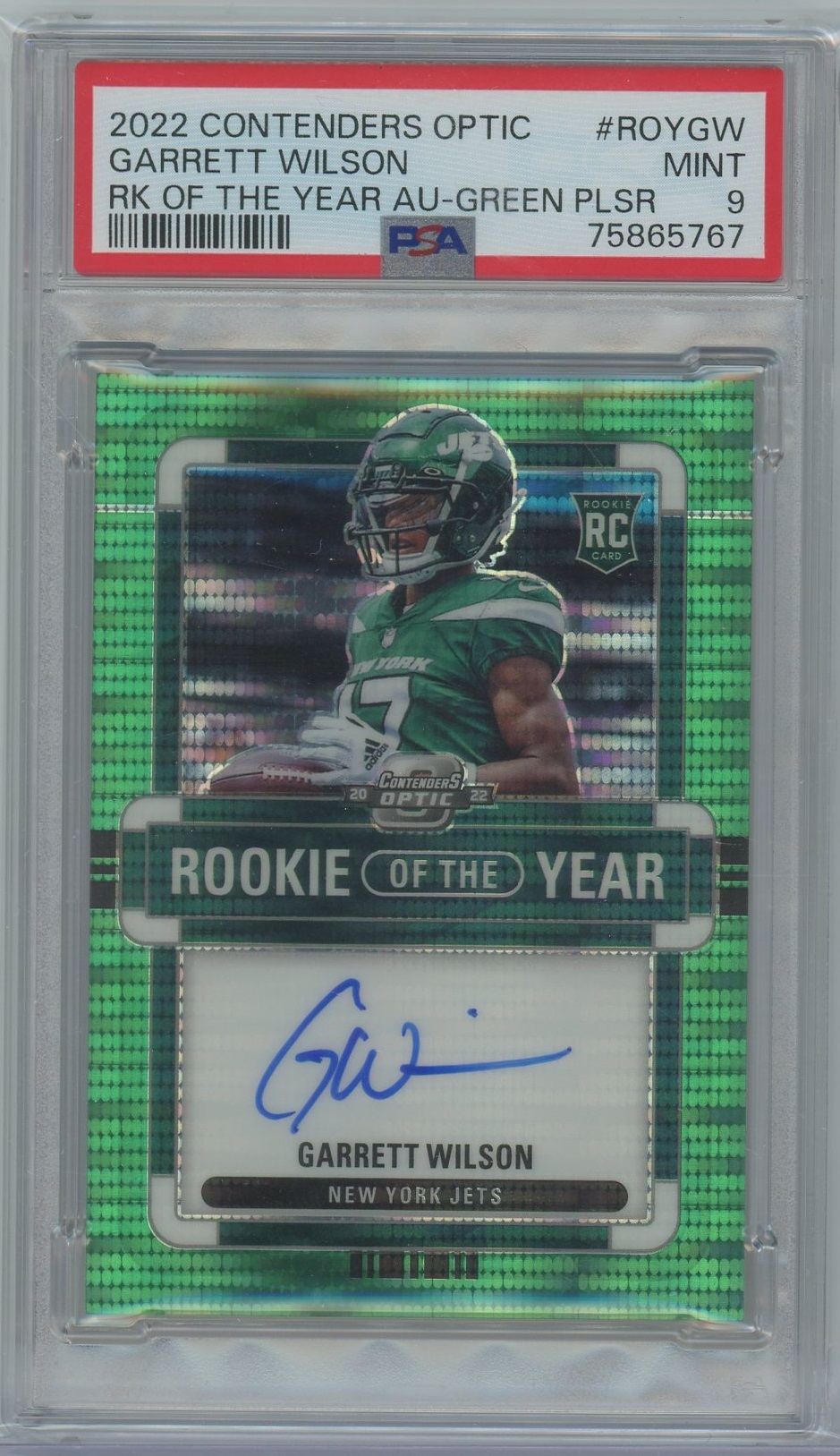 Garrett Wilson 2022 Contenders Optic Rookie of the Year Contenders Green Pulsar Auto- #’d 25- PSA 9