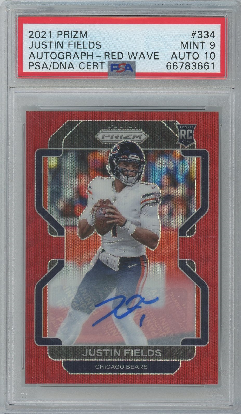 Justin Fields 2021 Prizm Red Wave Auto- #’d 149- PSA 9