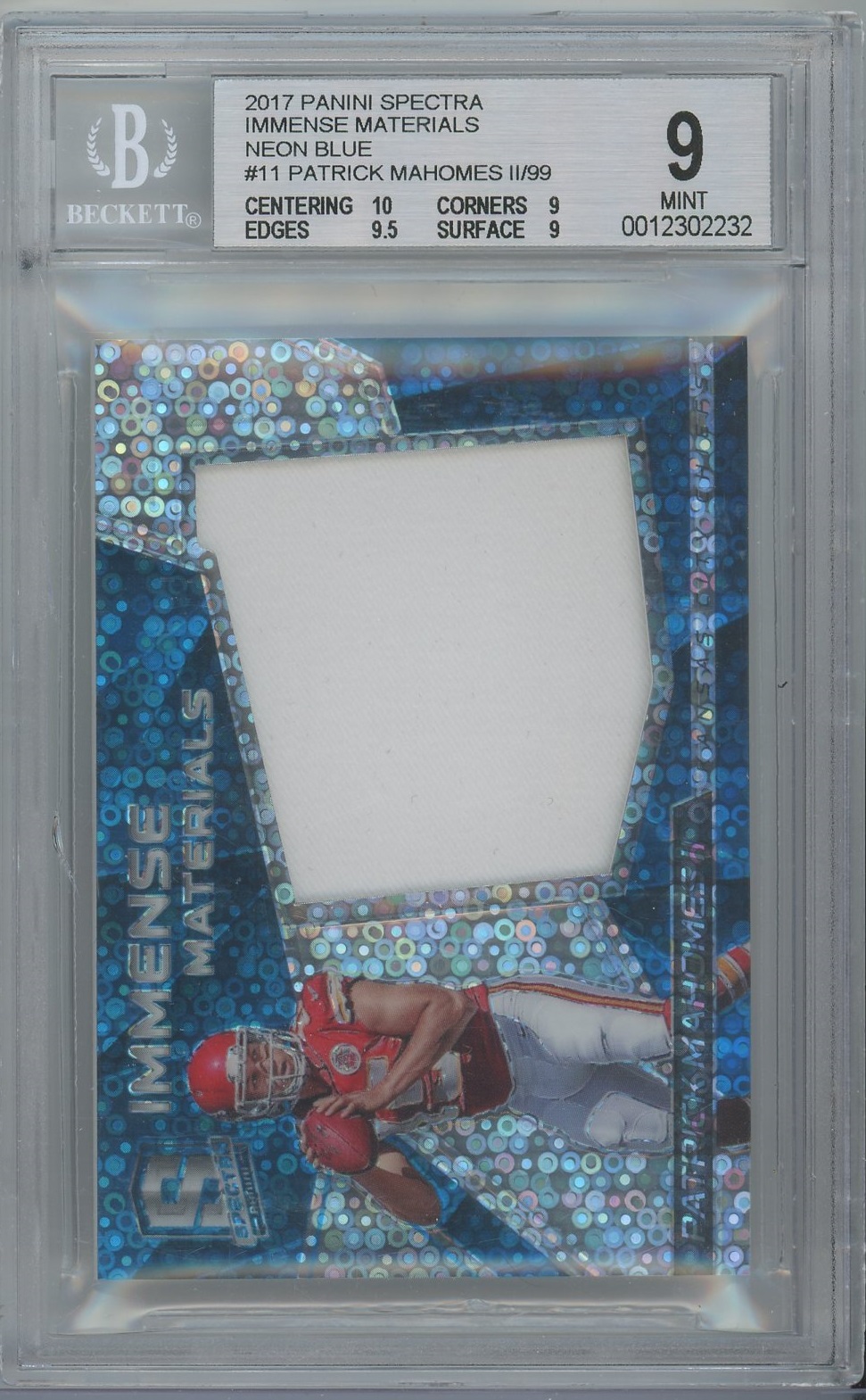 Patrick Mahomes 2017 Spectra Immense Materials Neon Blue Patch- #’d 99- BGS 9