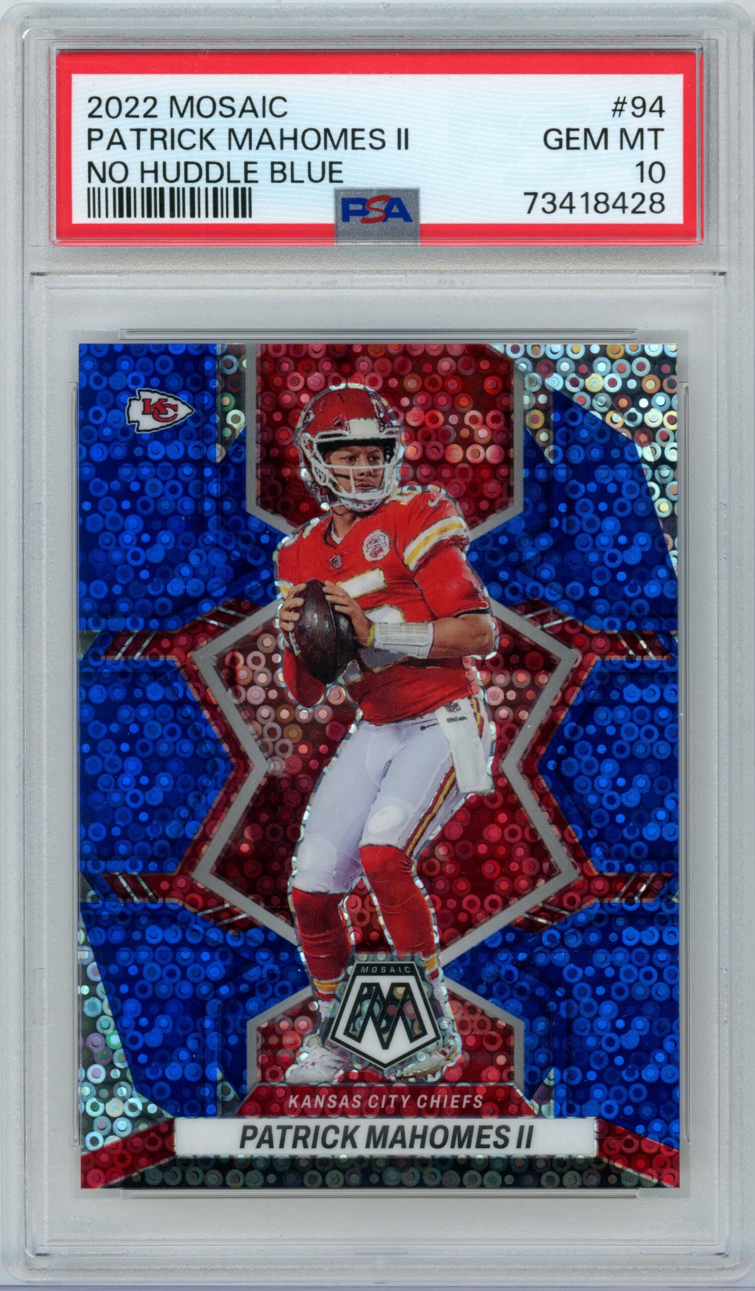 Patrick Mahomes 2022 Mosaic No Huddle Blue Disco- #’d 75- PSA 10